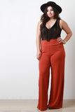 These plus size pants feature a wide leg cut, stretchy soft knit fabrication, and finished with a fold over waist band. High-waist silhouette. Accessories sold separately. Made in U.S.A. 95% Polyester, 5% Spandex.