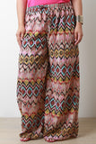 These plus size pants feature geo pattern print, elasticized waist, self-tie drawstring, and wide legs. Accessories sold separately. 100% Polyester.