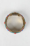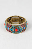 This bracelet features gold-tone frame, colorful embossed patterns, gemstone beads, and stretchy cord.