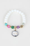 This lovely bracelet features a colorful stone beaded design with brass spacers, center gemstone with rhinestones accent charm, and easy slip-on construction.