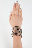 This cuff bracelet features a multi colored loose wires, faux stacked bracelet design, metal beads and wire wrapping details. Open ends for easy on/off.