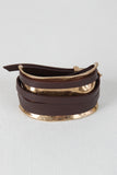 This cuff bracelet features a wrap design, with vegan leather straps, metal half cuff with upturned edges, and an adjustable buckle closure.