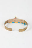 This Aztec inspired cuff bracelet features a crafty design, metal cuff, vegan leather wrap detail with colorful embroidery and round charms. Open ended for easy on/off.