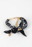 This bracelet features a knotted fabric bandana design, with chain tassels and an adjustable lobster claw closure.