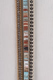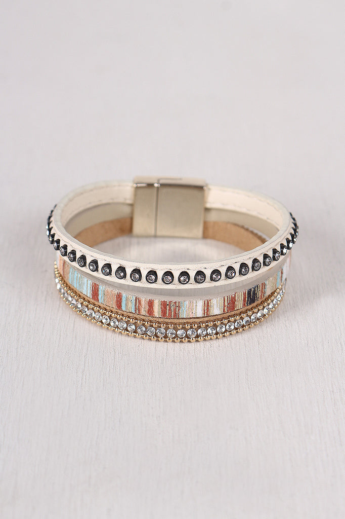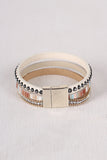 This bracelet features a vegan leather fabrication, rhinestone detail, metallic detail and a magnetic snap closure,