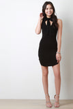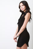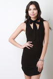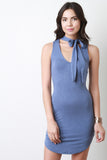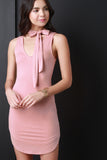 This mini dress features sleeveless construction, a v-neckline with a self tie and soft knit fabrication. Finished with a rounded hemline and a sculpture fit. Accessories sold separately. Made in U.S.A. 95% Rayon, 5% Spandex.