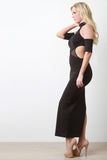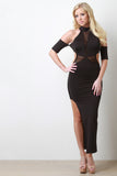 This form-fitting maxi dress features smooth stretch knit, semi-sheer fishnet panels, mock neck, open shoulders, short sleeves, side cut-outs, side slit, and back keyhole cut-out with double button closure at nape. Accessories sold separately. Made in U.S.A. 92% Polyester, 8% Spandex.