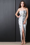 This strapless maxi dress features an elasticized tube top neckline, ruched empire waist seam, side and back cutout, center vent slit, and tie dye pattern print. Accessories sold separately. Made in U.S.A. 95% Rayon, 5% Spandex.