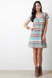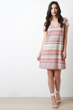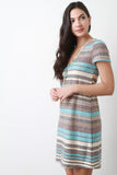 This casual dress features a multi colored striped pattern, rib knit fabrication, deep V-neckline, deep V back, A-line cut and a tie closure at the nape. Accessories sold separately. Made in U.S.A. 51% Rayon, 44% Polyester, 5% Spandex.