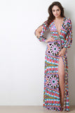 This maxi dress features a deep v neckline, and elastic waist, long sleeves with open slit from shoulder to wrist, a thigh high slit in skirt, and a soft knit fabrication. Accessories sold separately. Made in U.S.A. 96% Polyester, 4% Spandex.