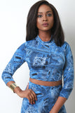 This top features denim pattern print design, mock neckline, quarter-length sleeves, and a crop hemline. Accessories sold separately. Made in U.S.A. 95% Polyester, 5% Spandex.