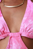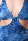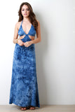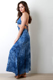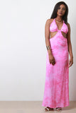 This backless dress features a triangle tie bikini style top, side cut outs and a maxi length skirt, woven fabrication, half lining, invisible back zipper, finished with a tie dye coloring. Accessories sold separately. 100% Rayon.