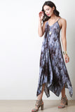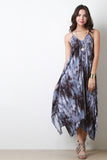 This bohemian inspired maxi dress features a challis fabrication, tie dye print, self tie adjustable spaghetti straps, v neckline, wide flare cut square hem and a loose flowing fit. Accessories sold separately. Made in U.S.A 100% Rayon.