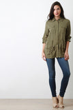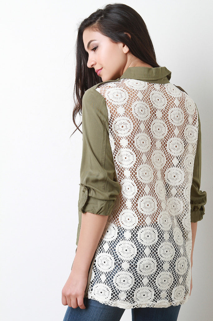 This long sleeve top features solid fabric main, snap button-up front, shirt collar, four pockets, self-tie drawstring, and crochet lace back. Accessories sold separately. Self: 100% Rayon. Contrast: 70% Cotton, 30% Polyester.