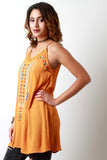 This native top features a woven knit fabrication, embroidered Aztec-inspired front detail, v-neckline with cutout crochet trim, and sleeveless fit. Finished with a halter back and twisted self-tie tassel-ended lace. Accessories sold separately. 100% Rayon