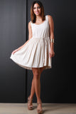 This mini dress features crinkled fabric, scoop neck, cut-out crochet back, self-tie waist string, and lining. Accessories sold separately. Made in USA. Self: 100% Rayon. Lining: 100% Polyester.