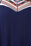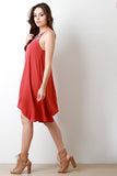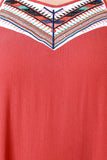 This simple dress featues a textured woven fabric, v-neckline, embroidered aztec patch detail at front, spaghetti straps, and asymmetrical hemline. Accessories sold separately. Made in U.S.A. 100% Rayon.