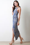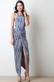 This tie dye dress features soft jersey knit, round neckline, twisted design, maxi length, front slit, and finished with partially hidden skirt. Accessories sold separately. Made in USA. 95% Rayon, 5% Spandex.