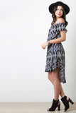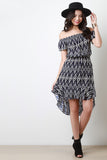 This pretty dress features an elasticized off-the-shoulder neckline, tribal print throughout, and short sleeves design. Finished with a cinched waist line and high low ruffled hem. Partially lined. Accessories sold separately. Made in U.S.A. 100% Rayon.