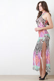 This maxi dress features a mesh fabrication, mock neckline, two thigh high side slits, sleeveless design, racerback cut, lower back cut out, finished with a rounded hem. Accessories sold separately. Made in U.S.A. 100% Polyester.