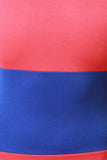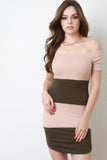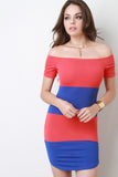 This bodycon dress features textured knit, color block panels, off the shoulder neckline, and short sleeves. Accessories sold separately. Made in USA. 95% Polyester, 5% Spandex.