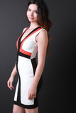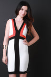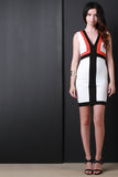 This bodycon dress features a v neckline, contrast contemporary style trim, sleeveless design, exposed metal zipper closure and a mini length hemline. Accessories sold separately. Made in U.S.A. 33% Nylon, 62% Viscose, 5% Spandex.
