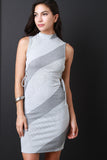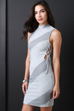 This body con dress features diagonal ribbed knit stripes, sleeveless mock neckline, lace up sides, sculpture fit, and a mini length hemline. Accessories sold separately. Made in U.S.A. 96% Polyester, 4% Spandex.