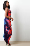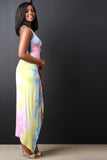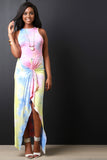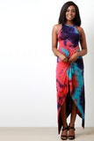 This eye-catching dress features a vibrant tie-dye print on a jersey knit fabric, twisted knot front detail, asymmetrical hemline, and sleeveless fit. Finished with an underlay pencil skirt and hidden rear zip-up closure. Accessories sold separately. Made in U.S.A. 96% Rayon, 4% Spandex.