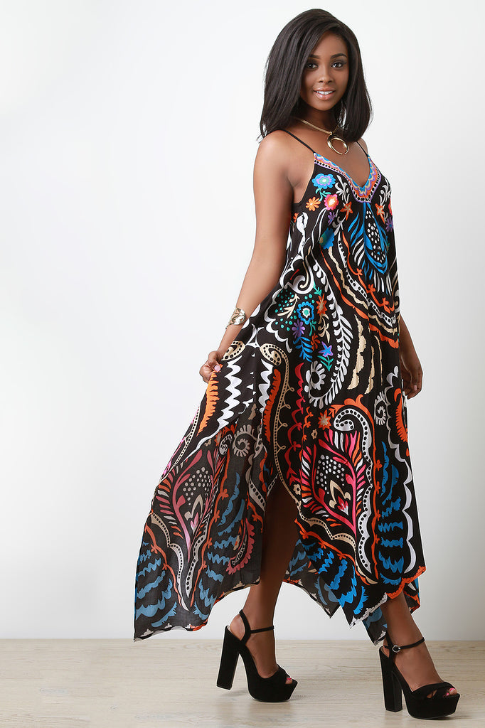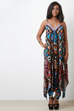 This brightly colored maxi dress features a woven fabrication, bright abstract floral print, v neckline, adjustable spaghetti straps, wide flowy cut, with a asymmetrical handkerchief hem. Accessories sold separately. 100% Rayon.
