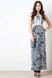 This sleeveless maxi dress features crochet lace upper half, side cutout, elasticized waist, and contrasting floral design throughout. Accessories sold separately. 96% Polyester, 4% Spandex.