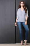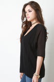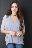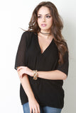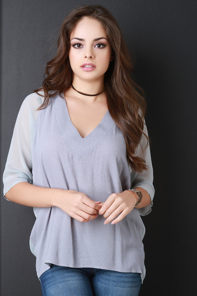 This top features semi-sheer fabric, deep v-neckline, half sleeves, and slight high-low hem. Accessories sold separately. Made in USA. 100% Rayon. Lining: 100% Polyester.