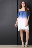 This midi dress features dip dye fabric, elasticized off the shoulder neckline, short sleeves, tassel accents, and finished with lining. Shell: 100% Rayon. Lining: 100% Polyester.