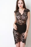 This sexy mini dress features a sheer lace fabrication, v neckline, cap sleeves, bodycon fit, asymmetrical hemline, and an exposed metal zipper back closure. Accessories sold separately. 100% Poly Chemical