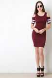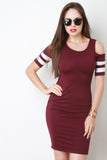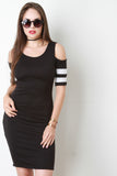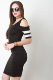 This bodycon dress features a round neckline, cold shoulders, short sleeves with contrasting striped panel, and a stretchy sculpture fit. Accessory sold separately. Made in U.S.A. 86% Polyester, 10% Rayon, 4% Spandex.