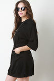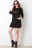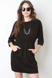 This casual dress features vegan suede, round neckline, dolman sleeves, elasticized waist, two pockets, and mini length. Accessories sold separately. 90% Polyester, 10% Spandex.