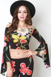 This top features a an off the shoulder elasticized neckline, long bell sleeves, and floral print. Accessory sold separately. 95% Polyester, 5% Spandex.