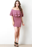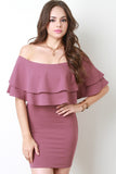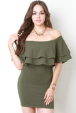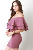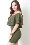This bodycon dress features an off the shoulder neckline, double flutter tier design, bodycon silhouette, and a mini hemline. Accessory sold separately. 96% Polyester, 4% Spandex.