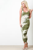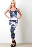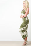 This jersey knit midi dress features a round neckline, sleeveless design, racer back, sculpture fit, elasticized ruched sides, and tie dye pattern print. Accessories sold separately. Made in U.S.A. 94% Rayon, 6% Spandex.