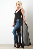 This fashion-forward bodysuit features a smooth knit fabric with a mesh maxi-length overlay, v-neckline, and sleeveless fit. Finished with a double snap button closure at crotch. Self: 95% Polyester, 5% Spandex. Contrast: 95% Polyester, 5% Spandex.