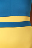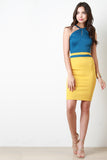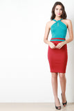 This stylish dress features a smooth stretchy knit, colorblock design, twist knot neckline, center back slit, and sleeveless fit. Finished with a rear zip-up closure and midi-length hemline. Accessories sold separately. Made in U.S.A. 96% Polyester, 4% Spandex.