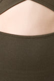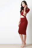 This sexy bodycon dress featuring stretch kit, criss cross front, cut out design, short sleeves, and midi length. Accessories sold separately. Made in USA. 95% Polyester, 5% Spandex.