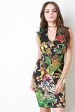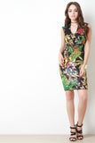 This beautiful dress features a stretchy knit fabric, tropical flowers print design, wide shoulder, and sleeveless construction. Finished with a rear zipper closure, mini-length hemline, and back center slit. Accessories sold separately. Made in U.S.A. 96% Polyester, 4% Spandex.