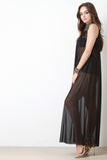 This daring dress features a semi-sheer chiffon fabric, studded yoke design, round neckline, and sleeveless fit. Finished with a maxi length hemline and zip-up closure at nape. Accessories sold separately. Made in U.S.A. Self: 95% Polyester, 5% Spandex. Contrast: 95% Polyester, 5% Spandex.