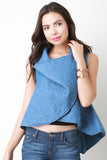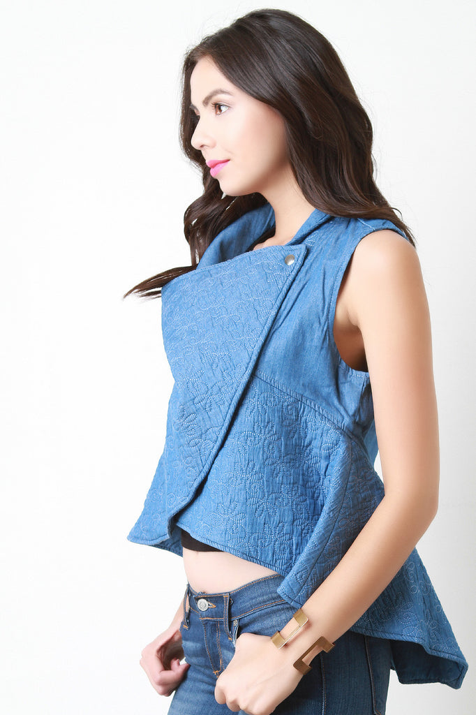 This denim vest features an embroidery top stitch detail, overlapping crepe front, to a single snap button closure, and flare cut fit. Accessory sold separately. 100% Cotton.