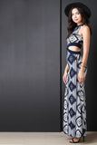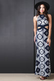 This maxi dress features smooth stretch fabric, geo pattern, round neckline, cut out design, and sleeveless construction. Made in USA. 95% Polyester, 5% Spandex.