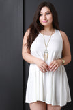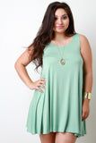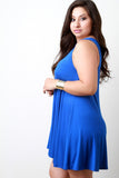 This sleeveless plus size dress features a jersey knit fabrication, boat neckline, relaxed fit, and mini-length hemline. Accessories sold separately. Made in U.S.A. 95% Rayon, 5% Spandex.
