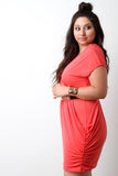 This plus size dress, features a ruched design along sides and shoulders for a fitted form. Short sleeves and v-neckline silhouette. Bottom portion is lined, remainder is unlined. Finished with a detachable belt. Other accessories sold separately. Made in U.S.A. 96% Polyester, 4% Spandex.