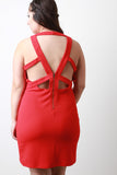 This plus size mini dress features a strappy caged design at the back, v-neck with double clasp & hook closure at nape, sleeveless construction, and finished with back zipper closure. Partially lined. Accessories sold separately. Made in U.S.A. Self: 95% Polyester, 5% Spandex. Lining: 100% Polyester.