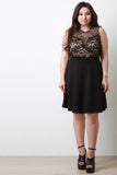 A floral lace back. Finished with a textured flared skirt. Accessories sold separately. Made in U.S.A. Self: 95% Polyester, 5% Spandex. Contrast: 97% Nylon, 3% Spandex.