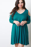 This relaxed plus size dress features jersey knit fabrication, v-neckline, cold shoulder three-quarters sleeves, and finished with a mini length hemline. Accessories sold separately. Made in USA. 95% Rayon, 5% Spandex.